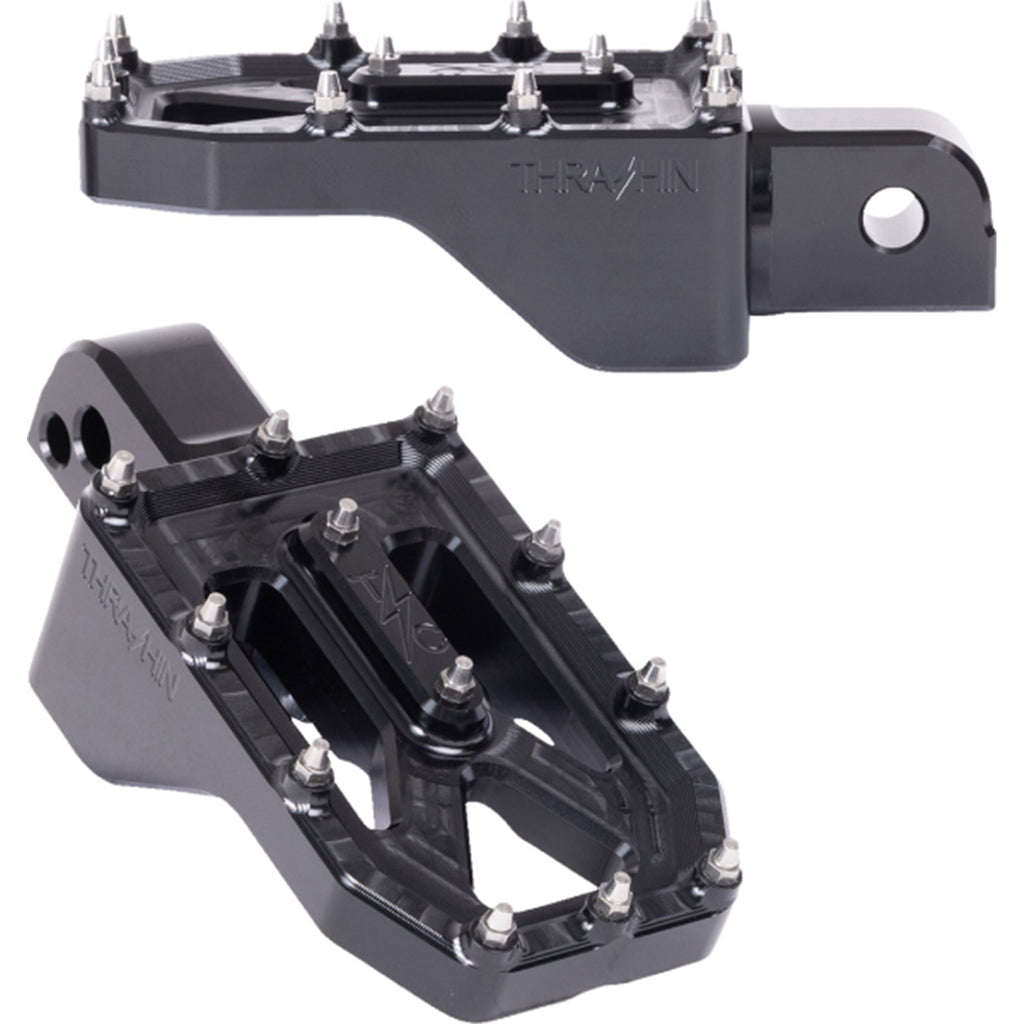 The THRASHIN Aggressor Footpegs are designed to provide the maximum amount of grip and improve ground clearance while maintaining a sleek and timeless design. Featuring 12 cone-shaped stainless steel cleats per footpeg, and a cutaway design to improve lean angle. These footpegs not only look great but will improve the feel of your motorcycle.