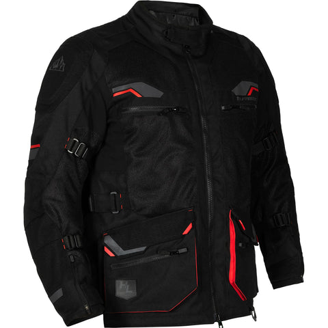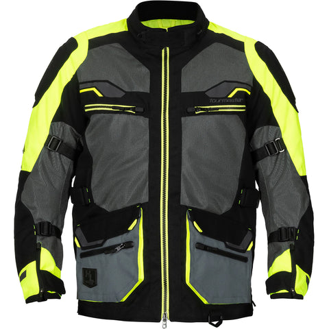 The Tour Master Ridgecrest Jacket is meticulously designed with a blend of abrasion-resistant materials like 600 denier polyester fabric and reinforced nylon ripstop, offering both durability and protection. Featuring CE-certified armor on shoulders and elbows, along with a removable EVA foam back pad, it prioritizes rider safety. With a range of adjustable features, ample storage options and comfort-enhancing elements like microfiber-lined collar and cuffs, this jacket ensures a customized fit and convenience for riders, complemented by reflective accents for added visibility and expansion panels for enhanced mobility.